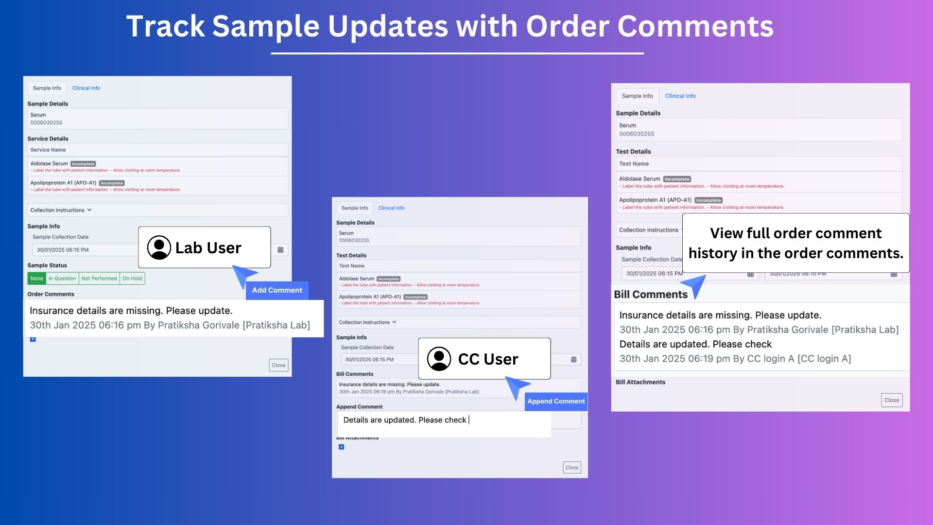 Lab users can add comments about the sample or patient in the Order Comments box (e.g., "Insurance details are missing. Please update.").View the Comment: