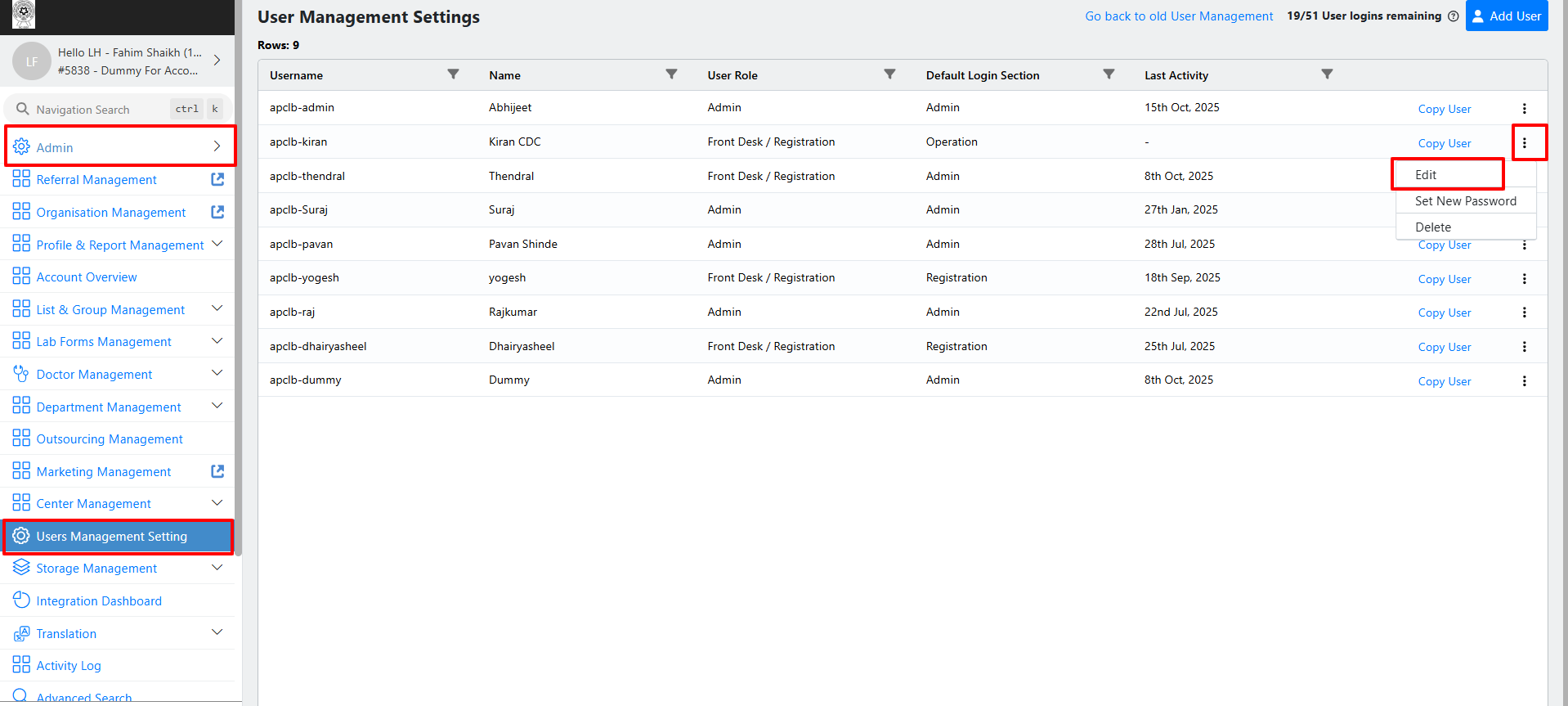 Note: To make any changes to an existing user or create a new user, please ensure that your ID has Admin → User Management access enabled.