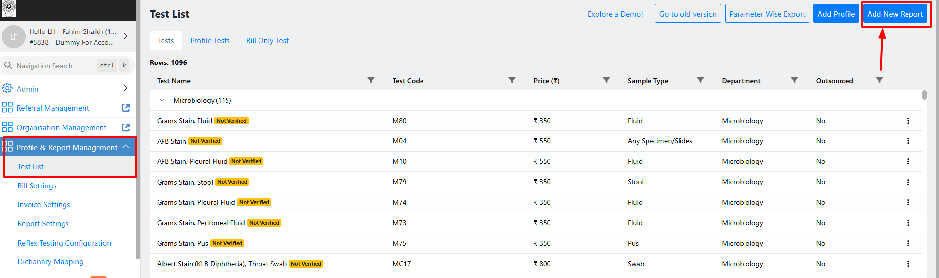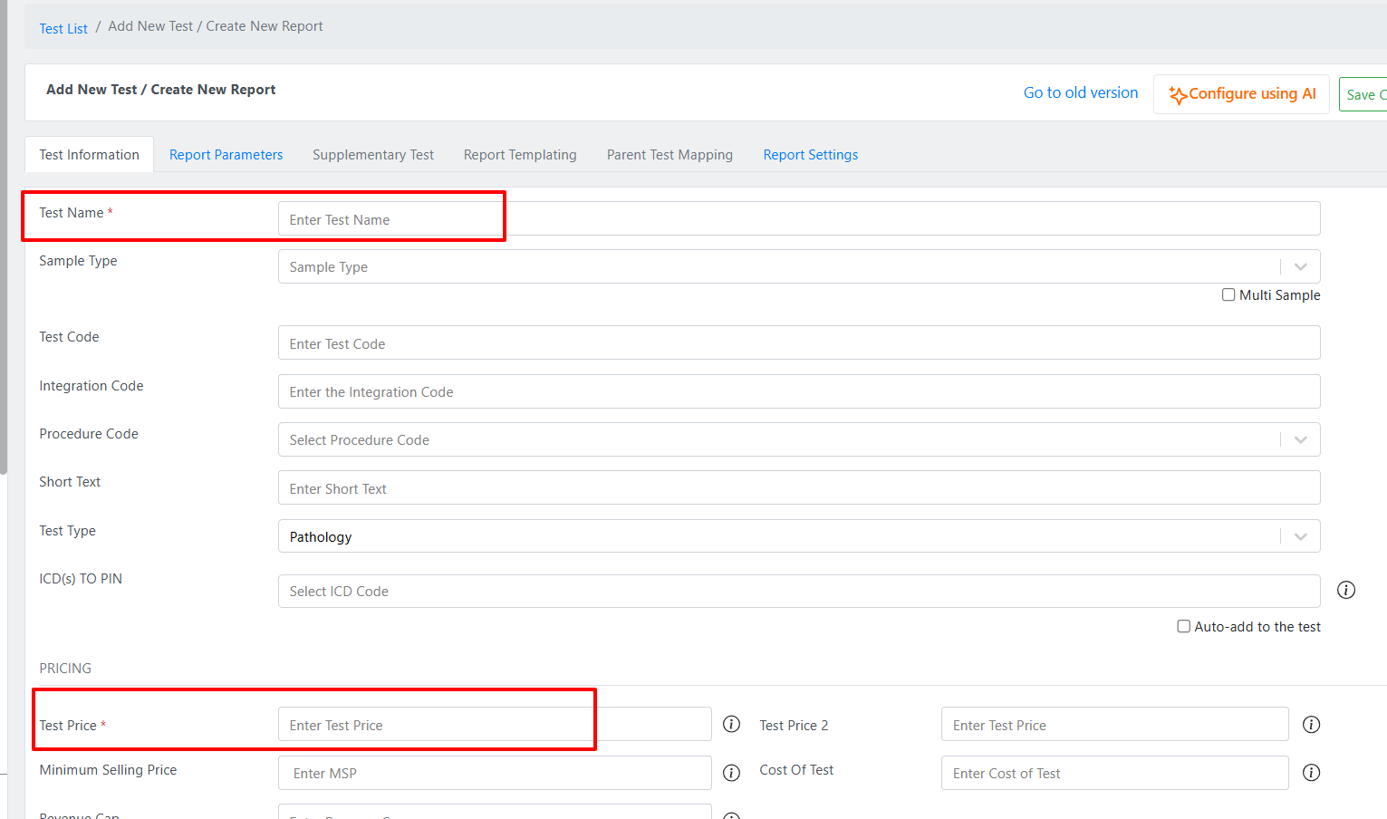 Enter the Test Name and Price.
